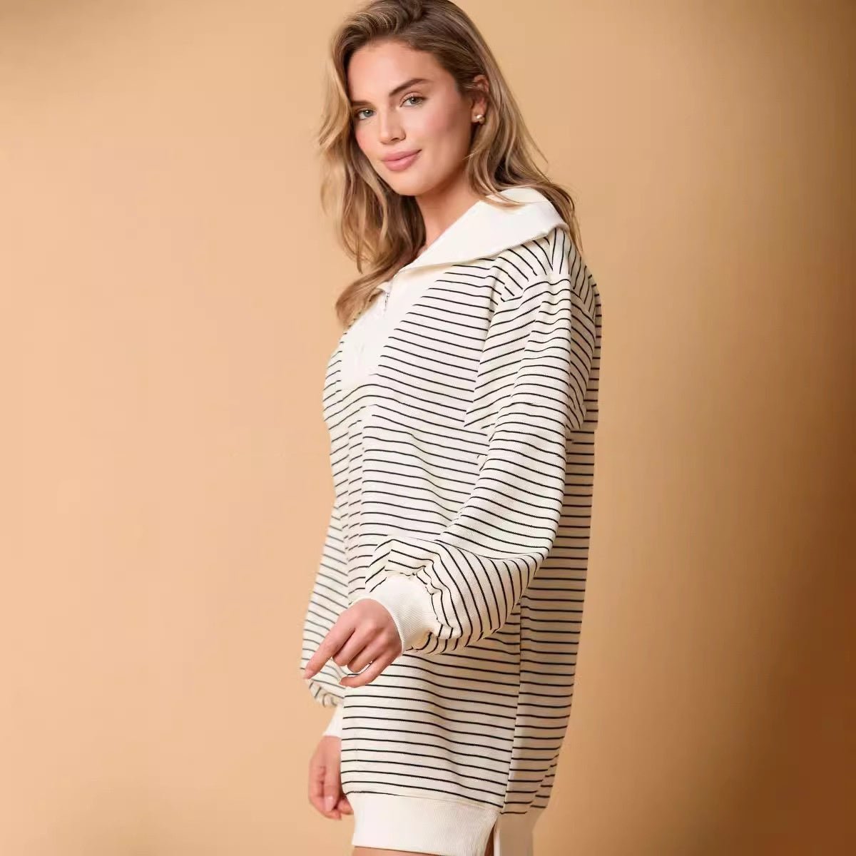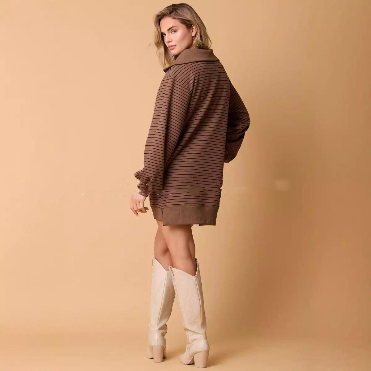 Women's Long Sleeve Polo Collar Stripes Loose Dress